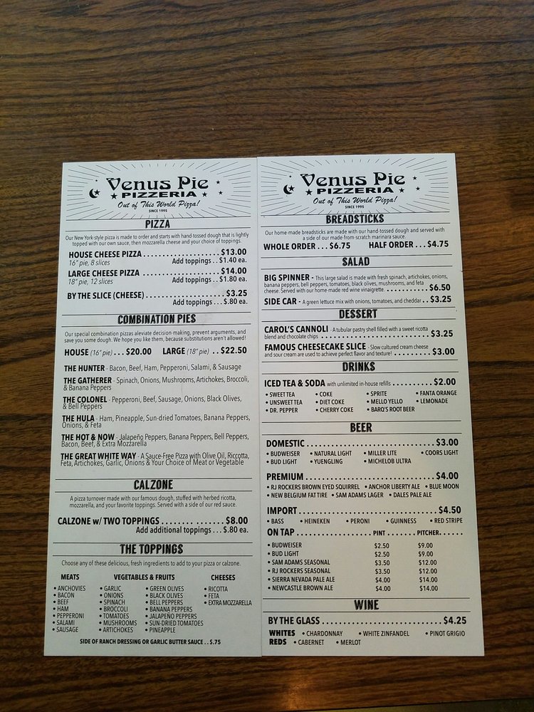 Welcome to Venus Pie Pizzeria, a beloved local gem nestled in Spartanburg, SC. This vibrant establishment is renowned for serving up authentic New York-style pizza that captivates both locals and visitors alike. Highlights of the menu include enormous slices with a perfectly crispy crust, topped with flavorful marinara and gooey cheese that leaves you craving more. Whether you're in the mood for classic cheese or adventurous toppings, there’s something for everyone, including many vegetarian options.